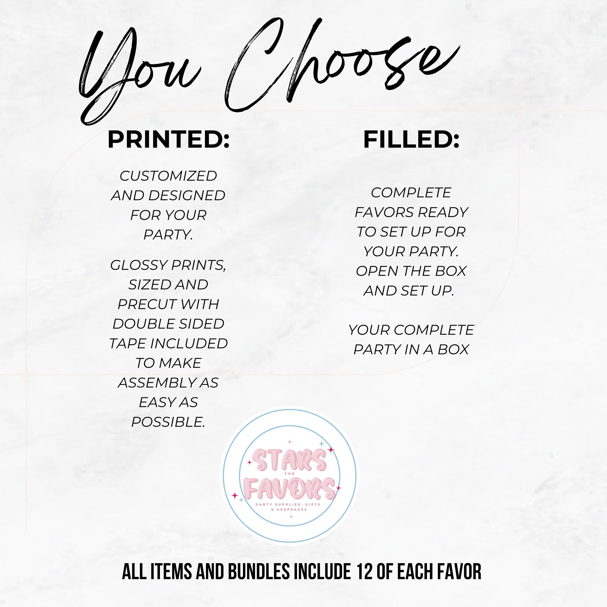 Get ready to make memories with our 4 Favor Party Theme Pack, a convenient, customizable, and stylish party solution that saves you time and brings your theme to life!