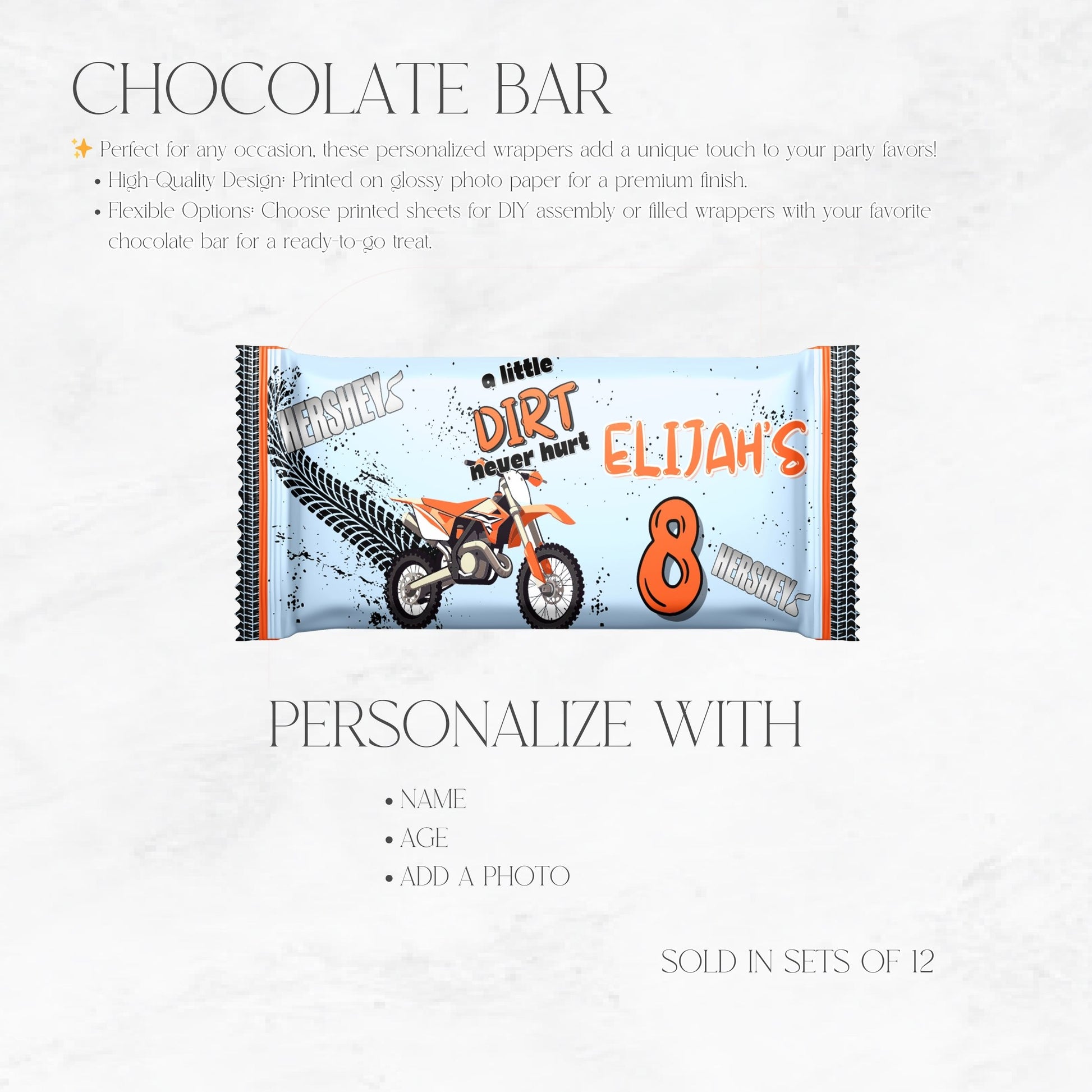Fuel up your celebration with custom Hershey chocolate bar party favors, designed in the exciting theme of "A Little Dirt Never Hurt Dirt Bike." Featuring a striking blue color scheme with tire track details, these wrappers are perfect for dirt bike enthusiasts of all ages. Available in digital, printed-only or filled and wrapped options for ultimate convenience.