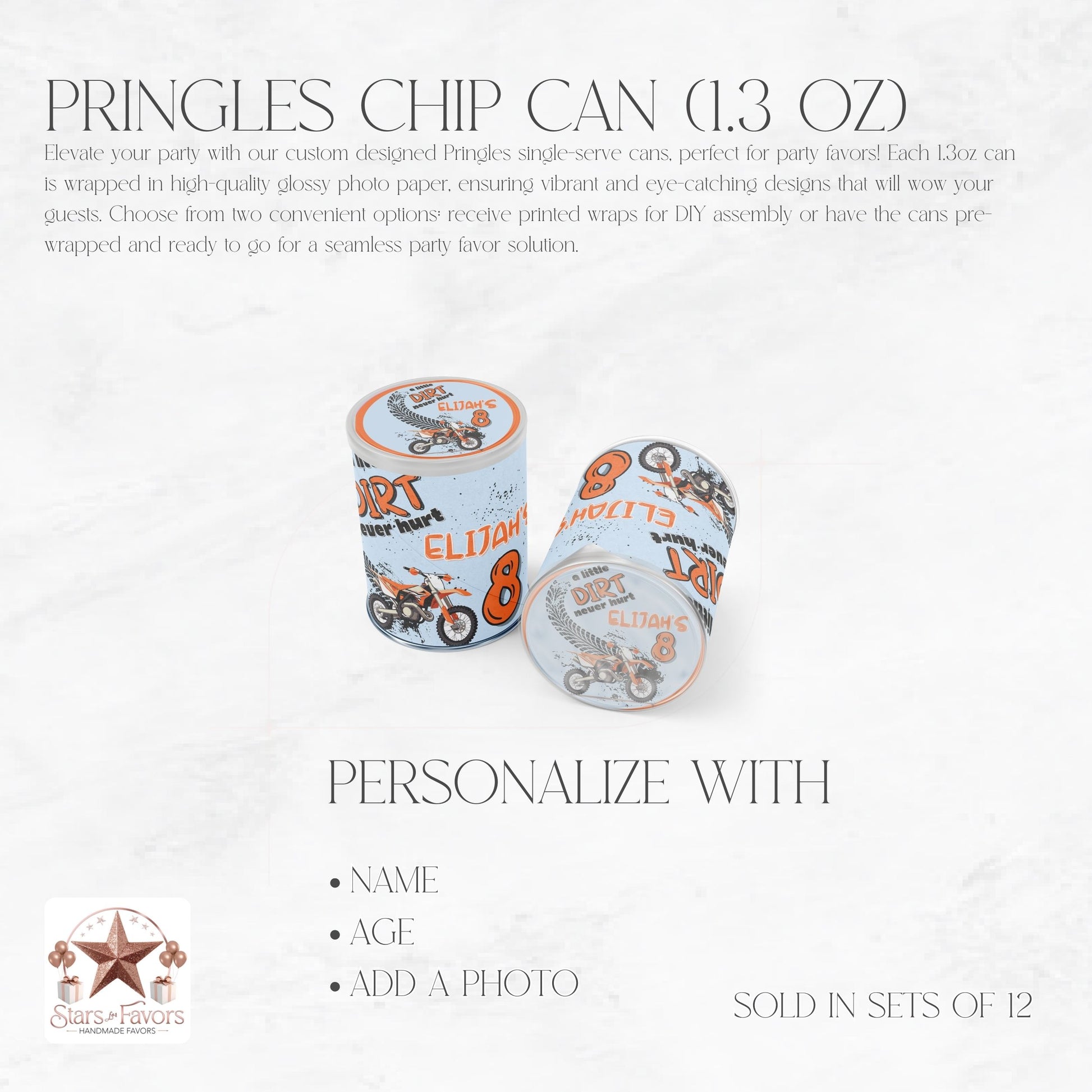 Take your party off-road with these custom Dirt Bike-themed Pringles can party favors! Featuring a bold blue color scheme and dynamic tire track design, these favors are perfect for dirt bike enthusiasts of all ages. Personalize each wrapper with the celebrant's name, age, and optional message to make your event truly unforgettable.
