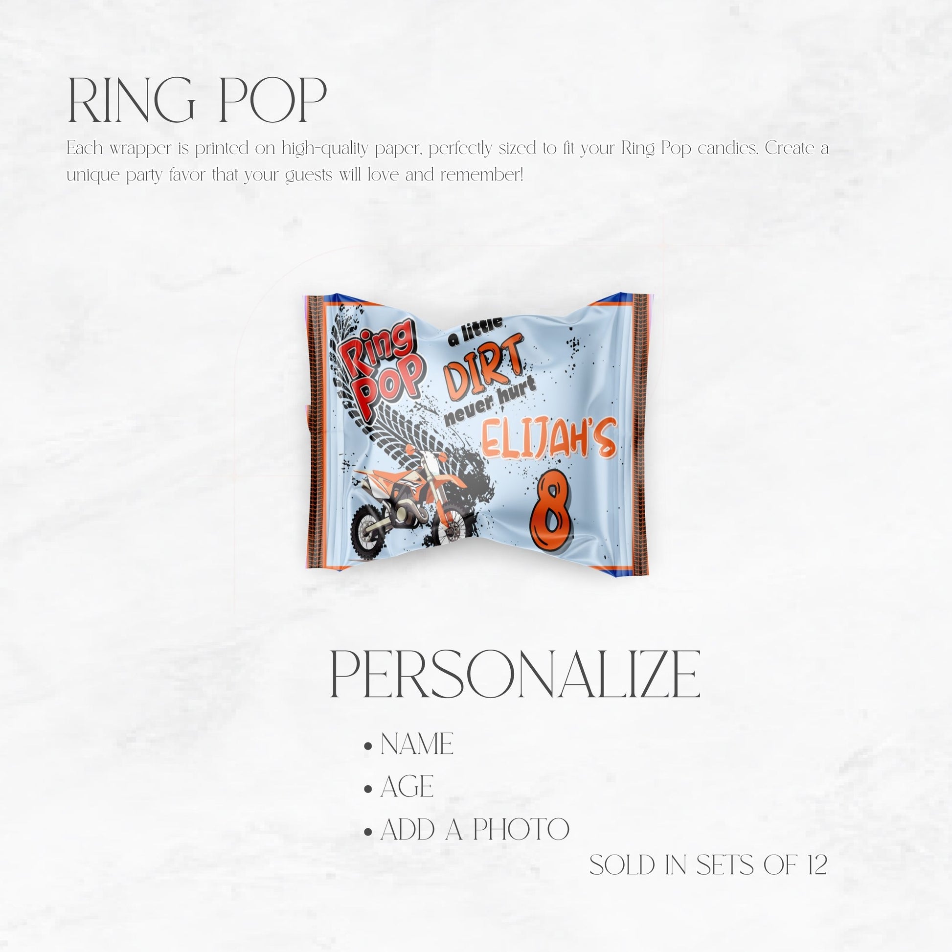 Add a sweet twist to your dirt bike-themed party with these custom Ring Pops, designed in the adventurous "A Little Dirt Never Hurt Dirt Bike" theme! Featuring a bold blue color scheme and fun tire track details, these treats make a perfect addition to any motocross or dirt bike birthday celebration. Sold in sets of 12, you can choose from printed options for an easy, ready-to-go favor or filled Ring Pops for an extra special treat.