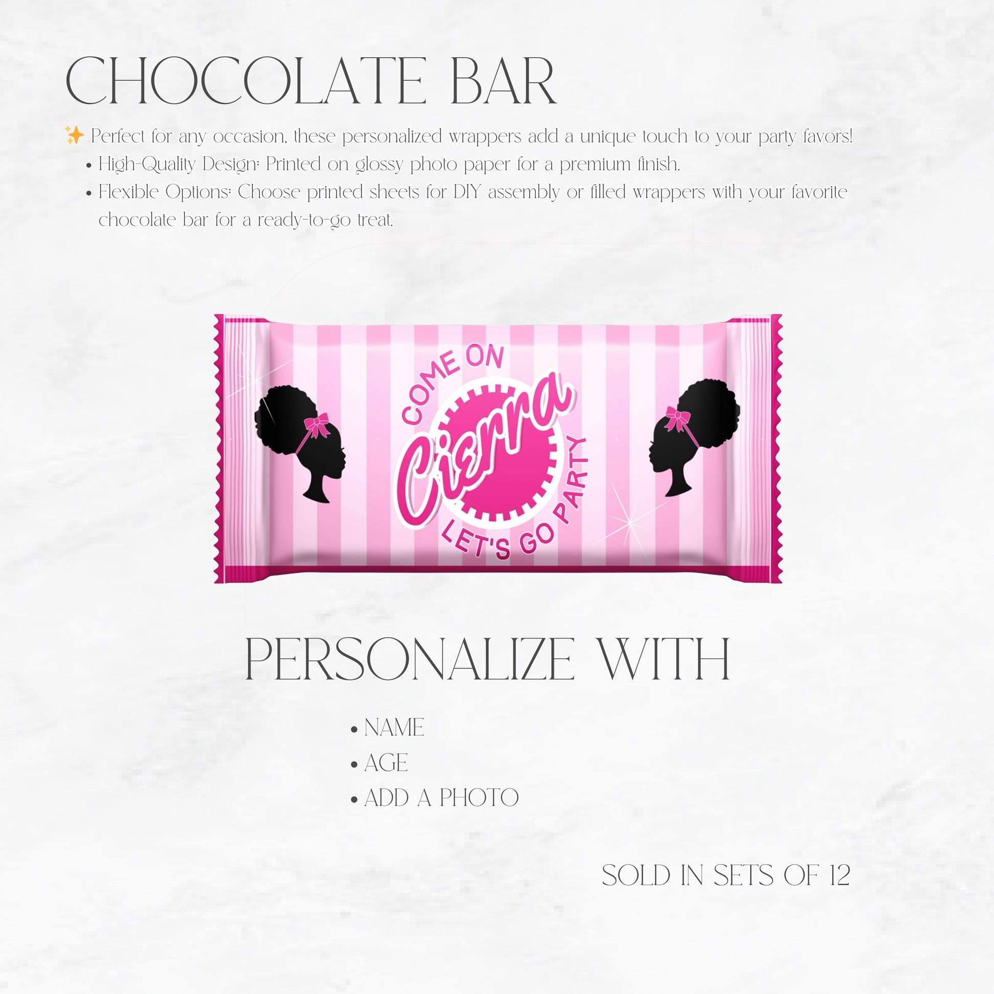 Transform your event with these stunning Afro Barbie Doll-themed Hershey chocolate bar wrappers! Designed with a chic two-tone pink classic stripe, these party favors are the perfect blend of elegance and personalization. Choose from printed wrappers for DIY assembly or filled chocolate bars for an all-in-one treat. These favors are ideal for birthdays, baby showers, or any celebration that calls for a touch of Barbie-inspired sophistication.