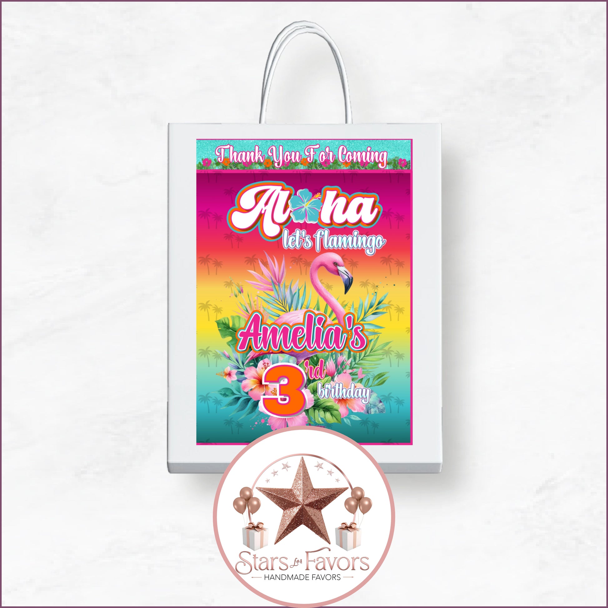 Make your tropical celebration unforgettable with this bold and vibrant Aloha, Letโs Flamingle Party Favor Collection! Bursting with pink flamingos, island florals, and sunset vibes, this tropical-themed set is personalized with your childโs name and age and available in your choice of digital, printed, or filled formats.