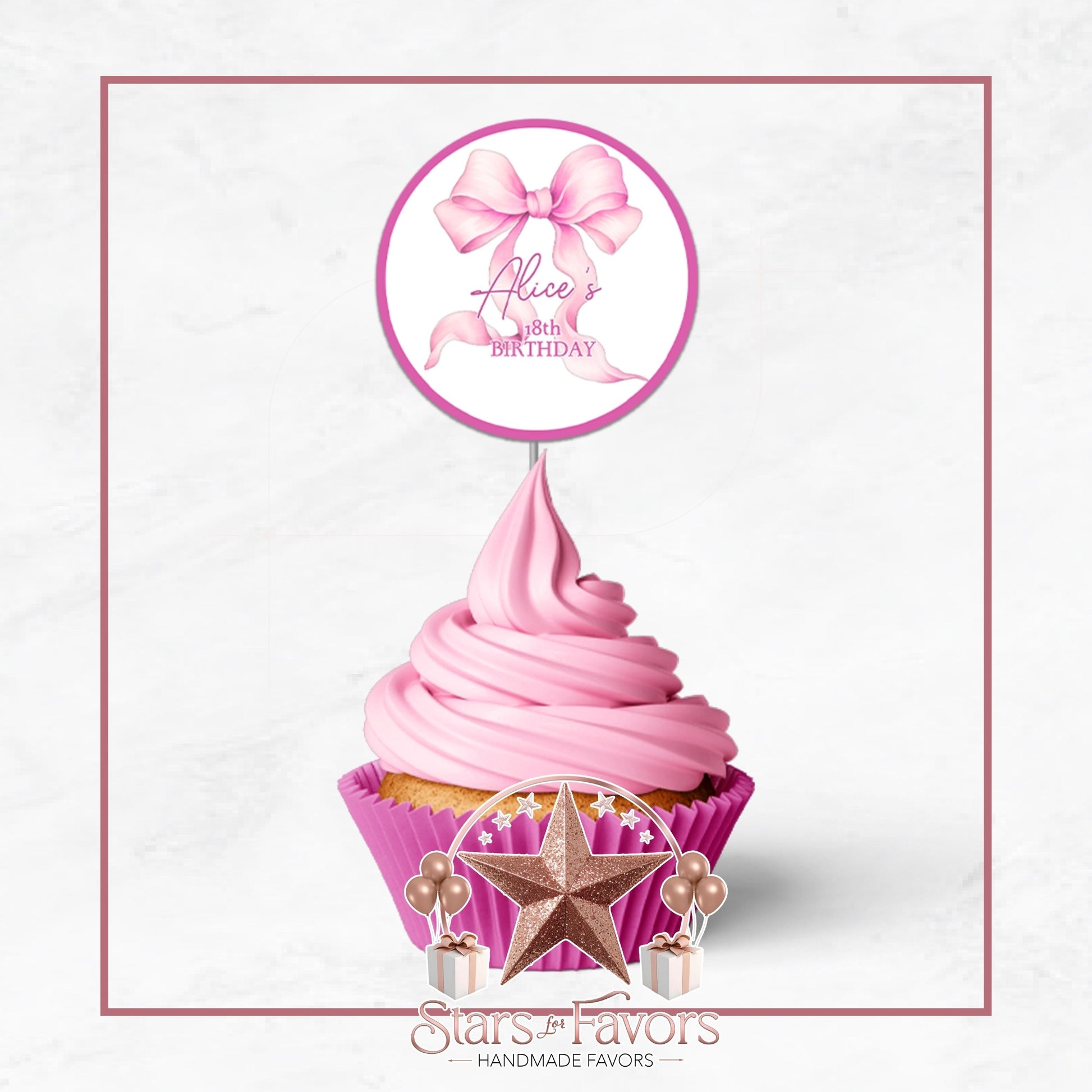 Each topper features a delicate watercolor-style pink bow with elegant script text customized with the name and age of your guest of honor. These toppers arrive fully assembled and ready to elevate your cupcakes, cake pops, or dessert display.