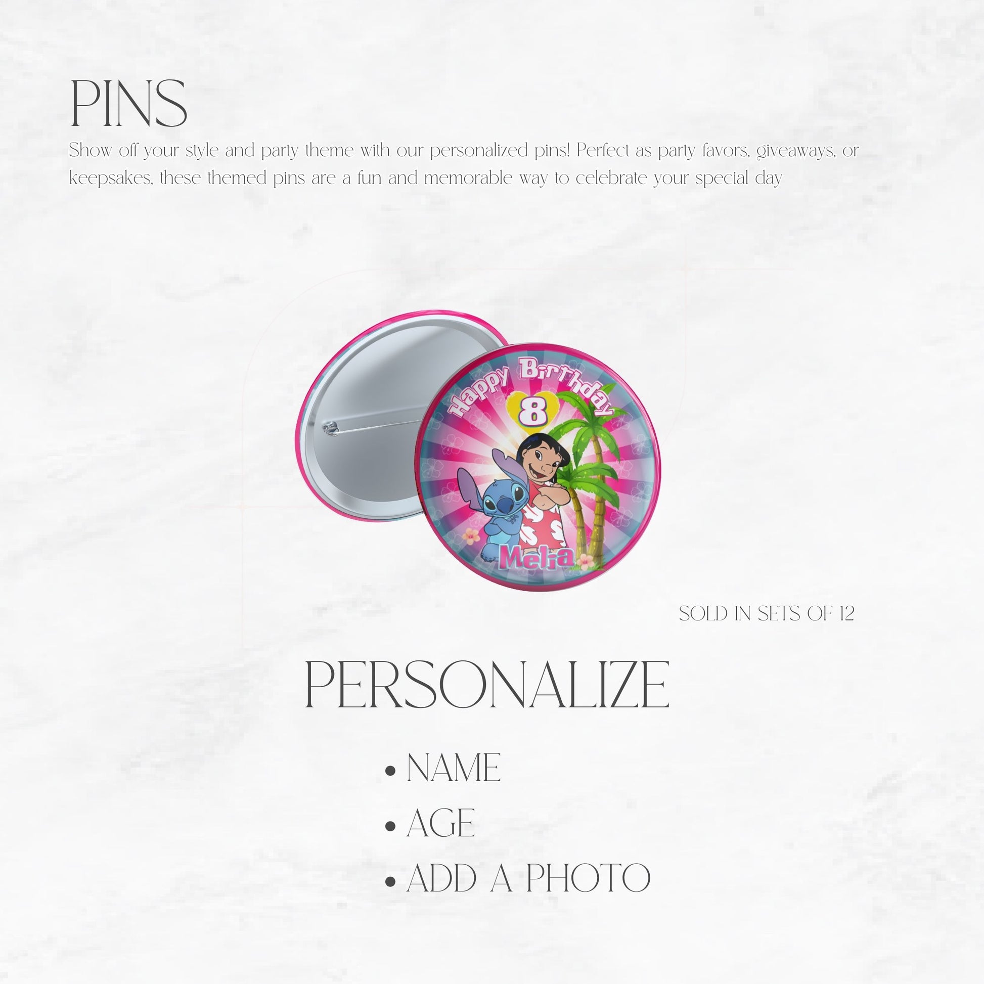 Add a fun finishing touch to your celebration with these adorable Lilo & Stitch party pins! Perfect as party favors, keepsakes, or accessories for birthday outfits, each pin is customized with your childโs name and age and features bright, tropical Stitch-inspired artwork.
