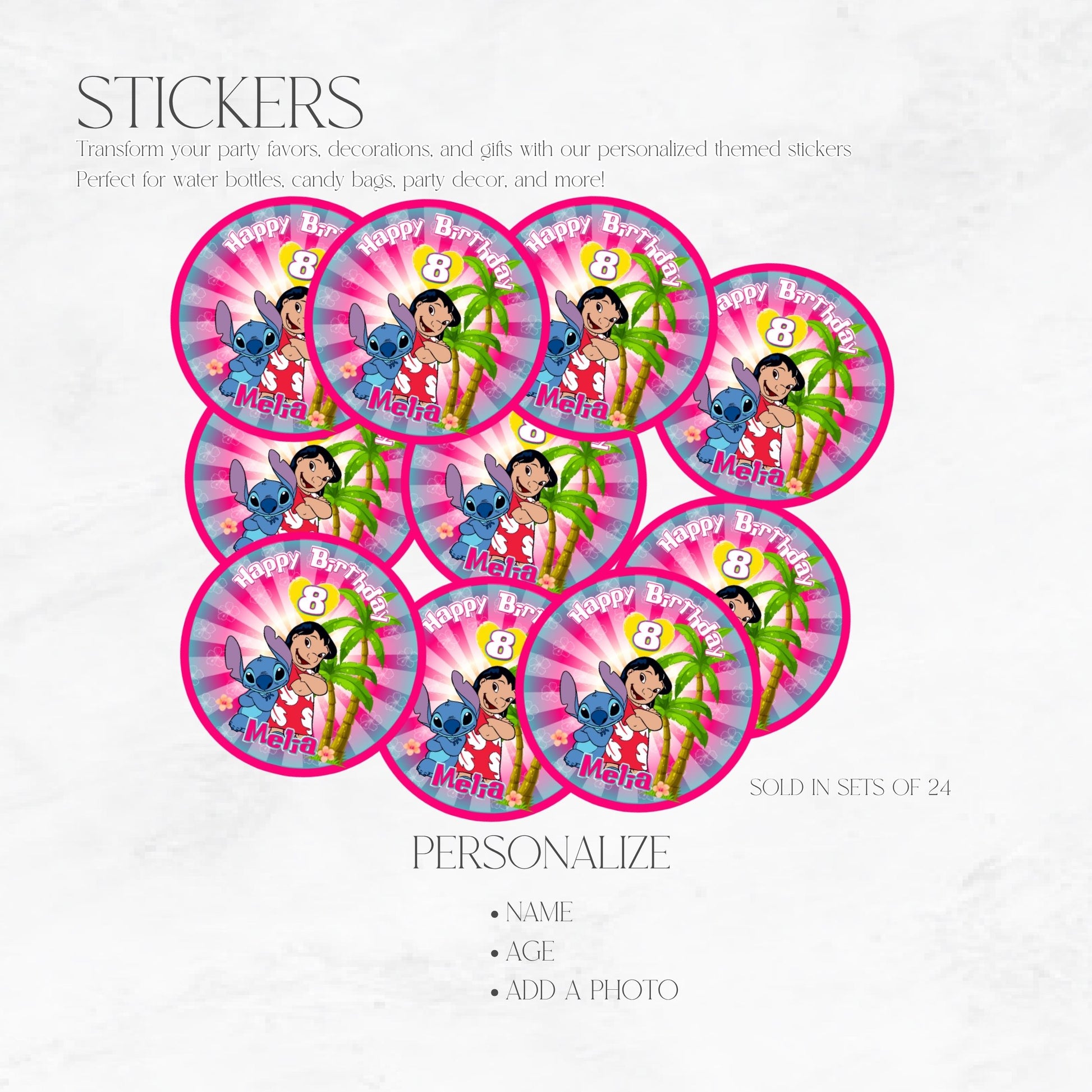 Add a splash of tropical fun to your party favors with these adorable Lilo & Stitch themed stickers! Perfect for sealing treat bags, decorating cups, party favors, or even as envelope seals, each sticker is personalized with your childโs name and age for a unique touch.