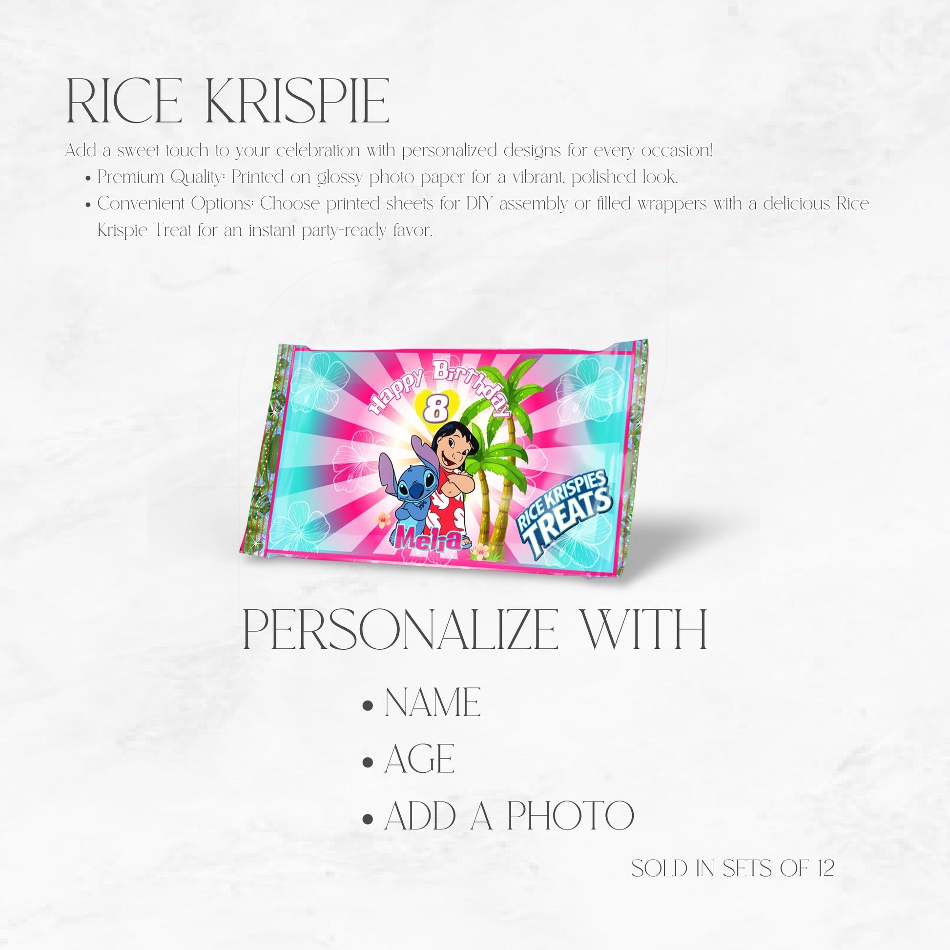 Add a sweet touch to your party table with these custom Rice Krispie treat wrappers in a Lilo & Stitch design! Choose between printed wrappers or fully wrapped and filled treats for stress-free setup.