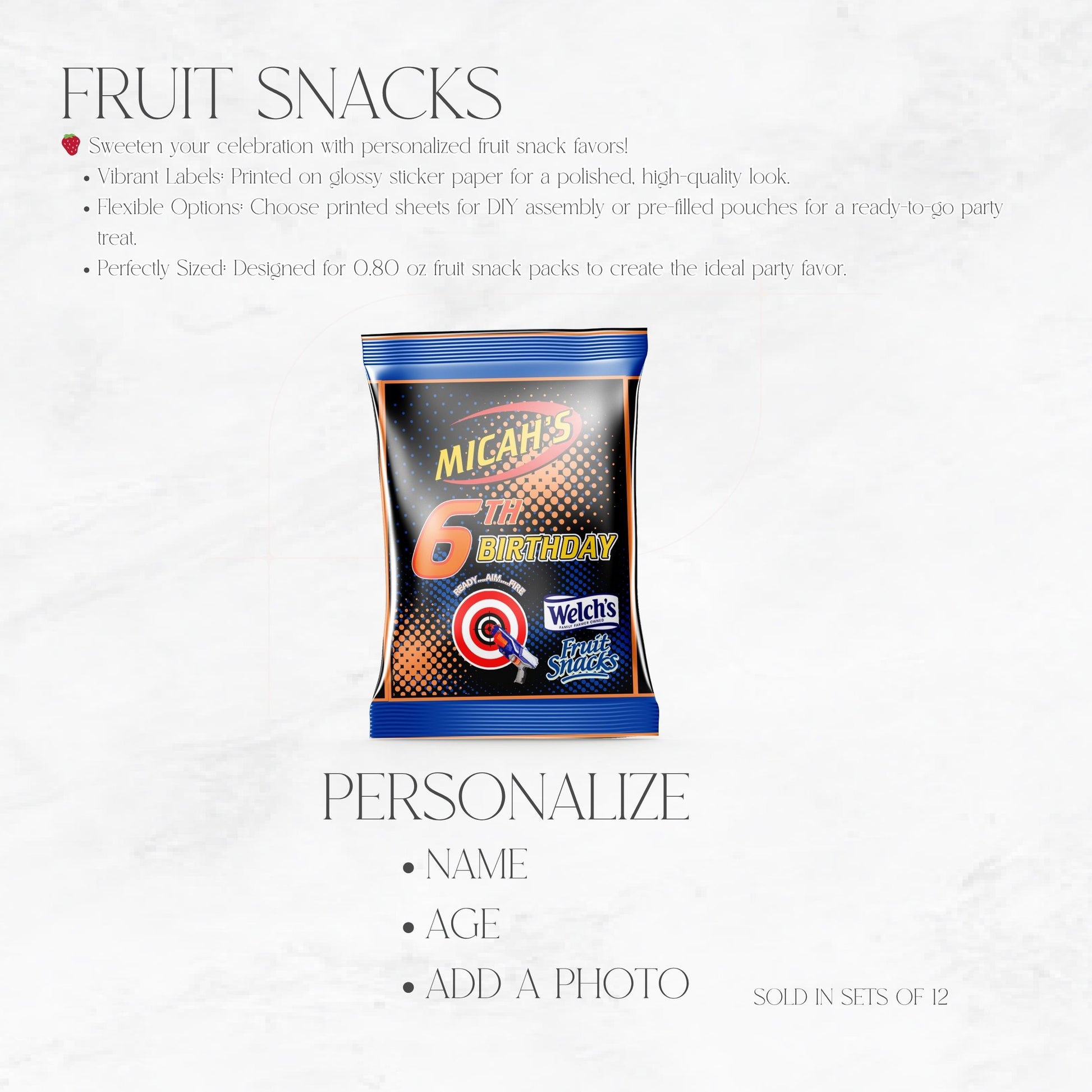 Make your celebration unforgettable with these custom Nerf-inspired fruit snack wrappers. Order your set of 12 today and get ready to aim for party perfection!