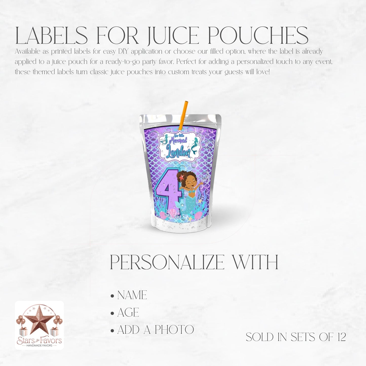 Make a splash at your next party with our enchanting "Our Little Mermaid" custom juice pouches! Featuring a beautiful African American mermaid in a magical purple and teal color scheme, these juice pouches are the perfect addition to any mermaid-themed celebration. Whether it's a birthday party, a baby shower, or a fun underwater adventure, our custom juice pouches will delight guests of all ages and add a touch of whimsy to your event.