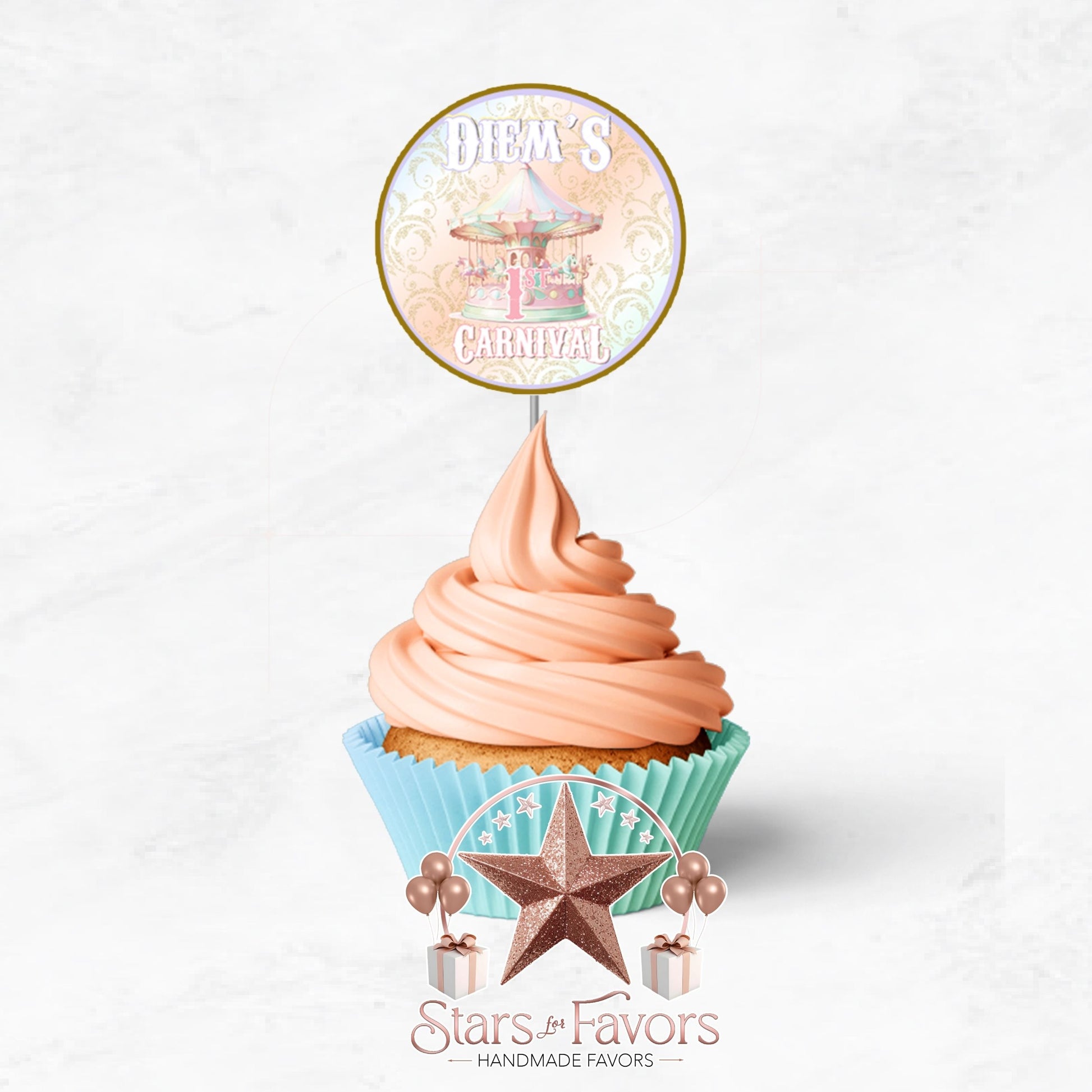 🧁 Pastel Carnival Cupcake Toppers – Personalized Party Decor (Set of 12)
