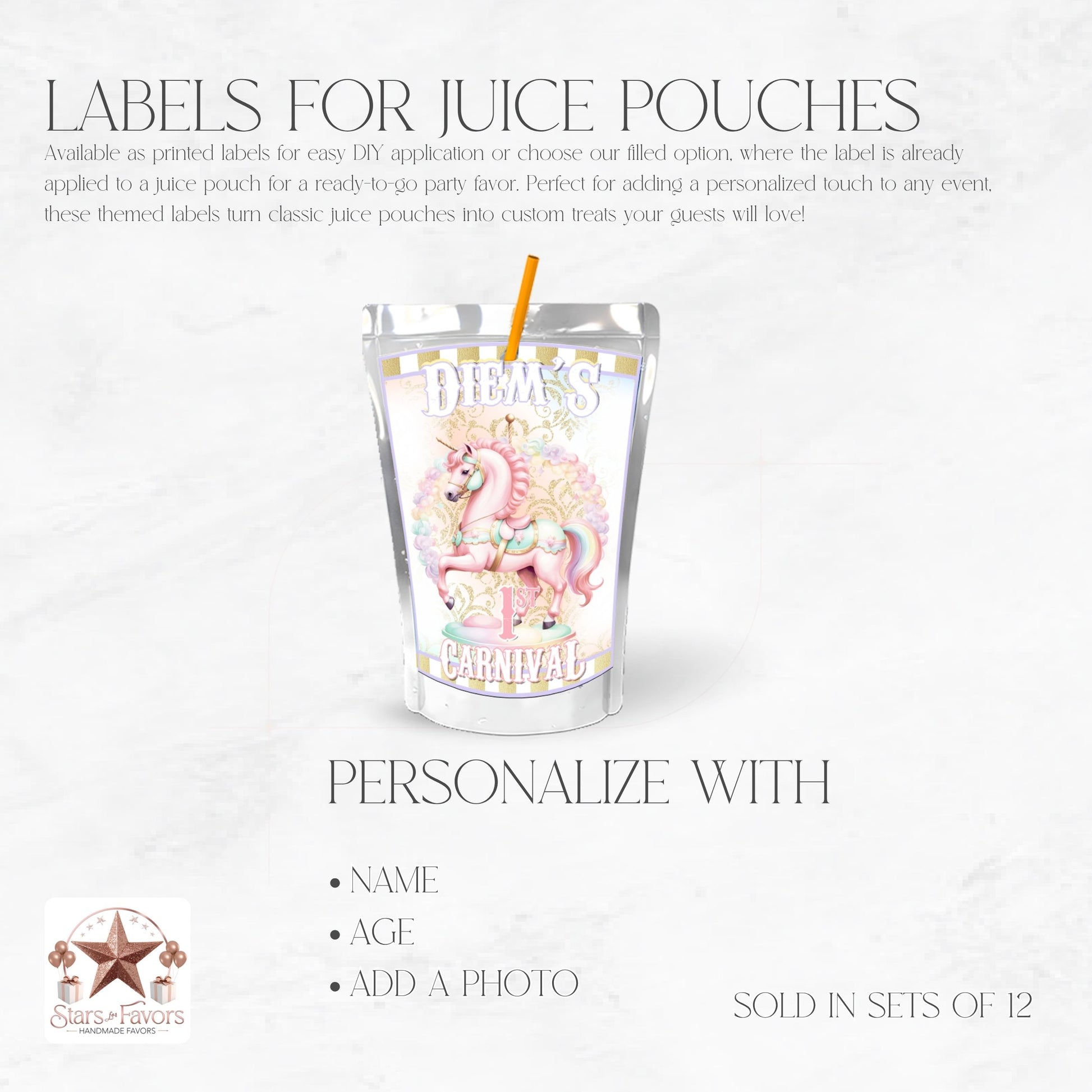 🎠 Pastel Carnival Capri Sun Labels – Personalized Party Favor Pouches (Set of 12)