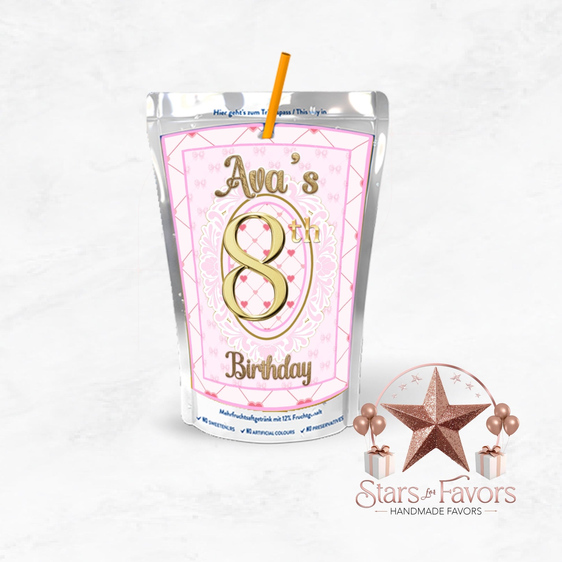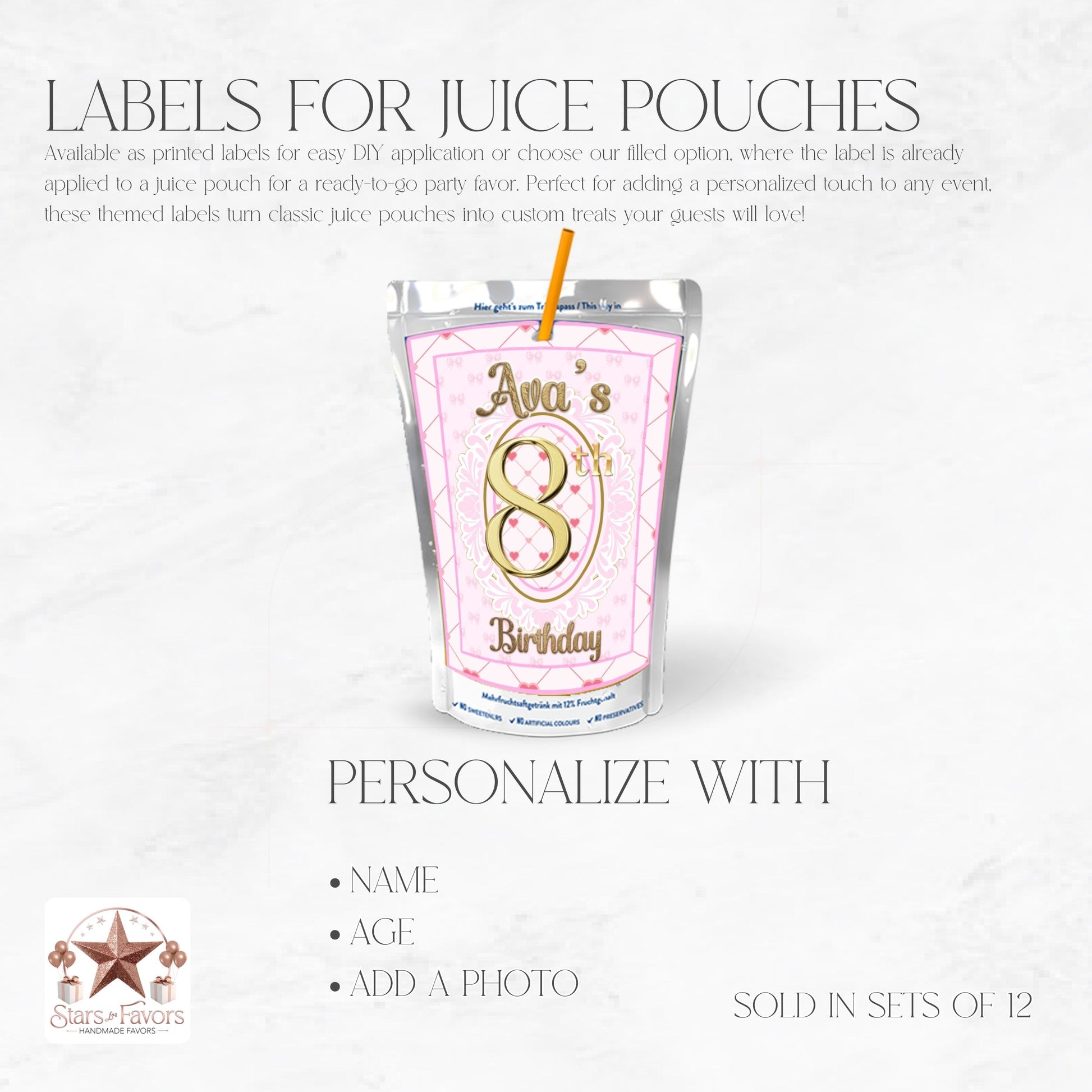 Elevate your celebration with our Pink Bows Capri Sun Labels, part of the elegant Pink Bows Collection! These charming drink pouches are perfect for girly birthday parties, featuring soft pink tones, delicate bow patterns, and luxe gold accents personalized with your child’s name and age.