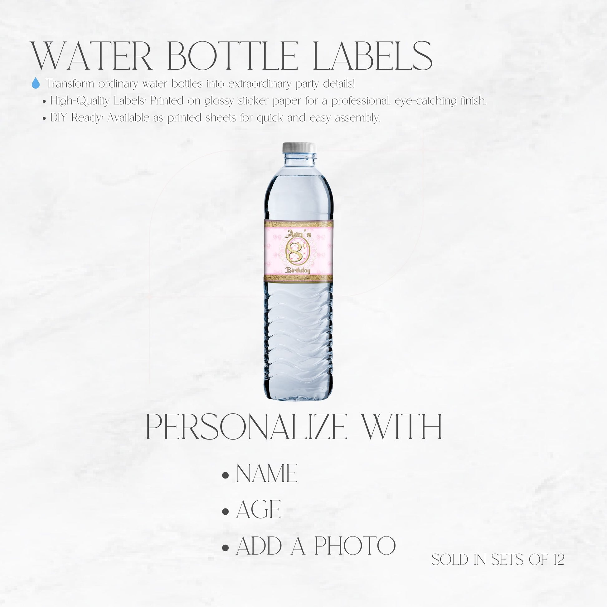 Add elegance to your drink station with Pink Bows Mini Water Bottle Labels, perfect for 8 oz mini bottles. Printed on waterproof sticker paper and customized for your event.