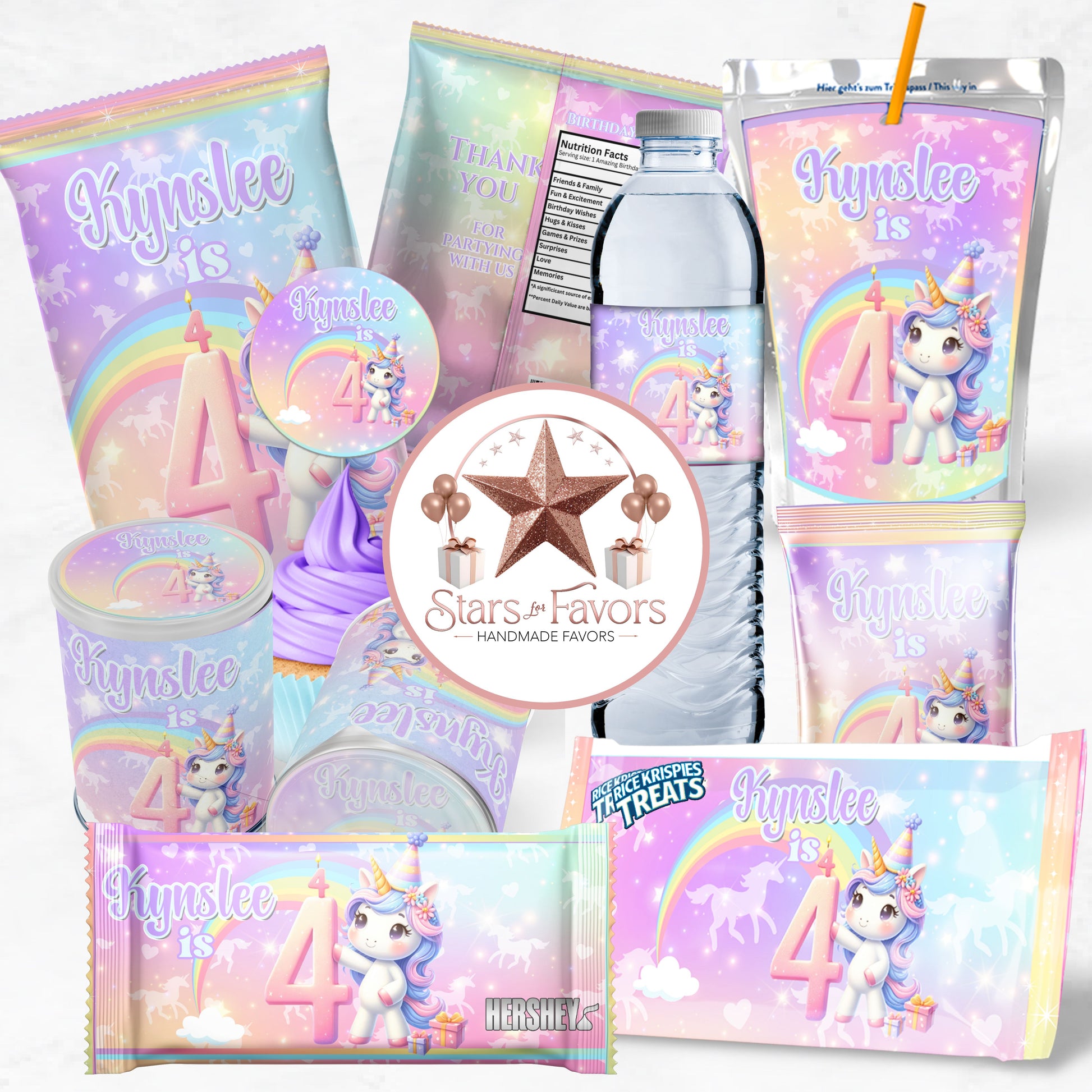 Make your celebration truly magical with this dreamy Rainbow Sparkle Unicorn Party Favor Collection! Featuring soft pastel hues, sparkles, rainbows, and an adorable unicorn, this collection is fully customizable with your childās name and age and available in three convenient formats: digital download, printed & shipped, or fully filled & assembled.