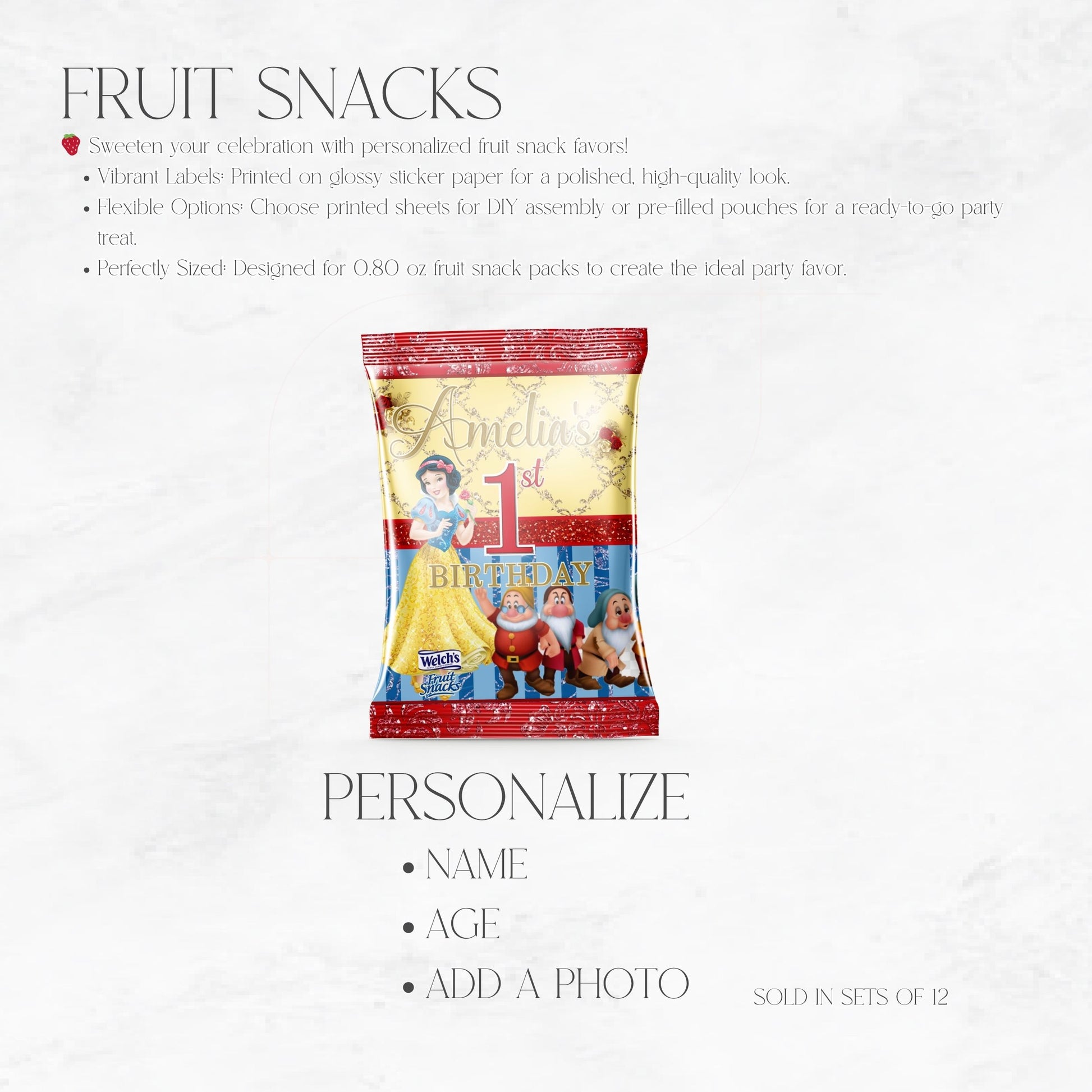 Add a magical touch to your celebration with these Snow White-themed fruit snack favors! Available as printed labels only or pre-filled with fruit snacks, these adorable favors are the perfect addition to your birthday party, princess-themed event, or enchanted celebration.