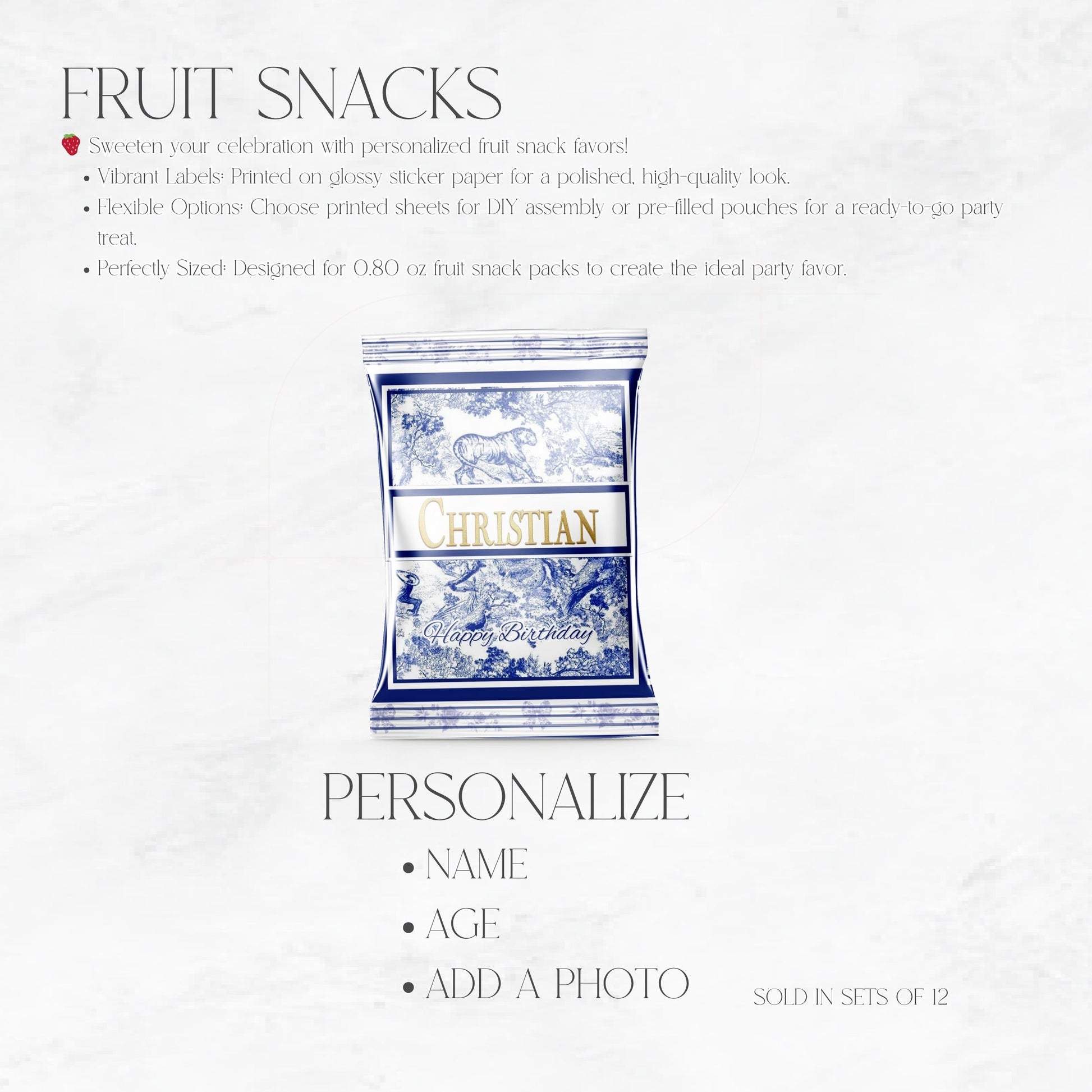 Toile de Jouy Custom Fruit Snack Favors – Elegant Blue & White Party Treats (Set of 12)