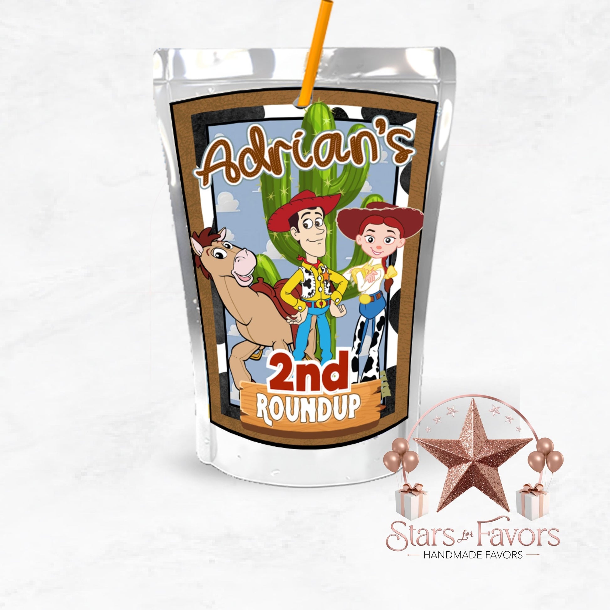 Yee-haw! Add a personalized, themed twist to your little one’s party with our Toy Cowboy Roundup juice pouch labels – available printed or fully assembled with drink included! These party favors are the perfect way to bring your Toy Story-inspired celebration to life and delight your little guests with something both fun and functional.