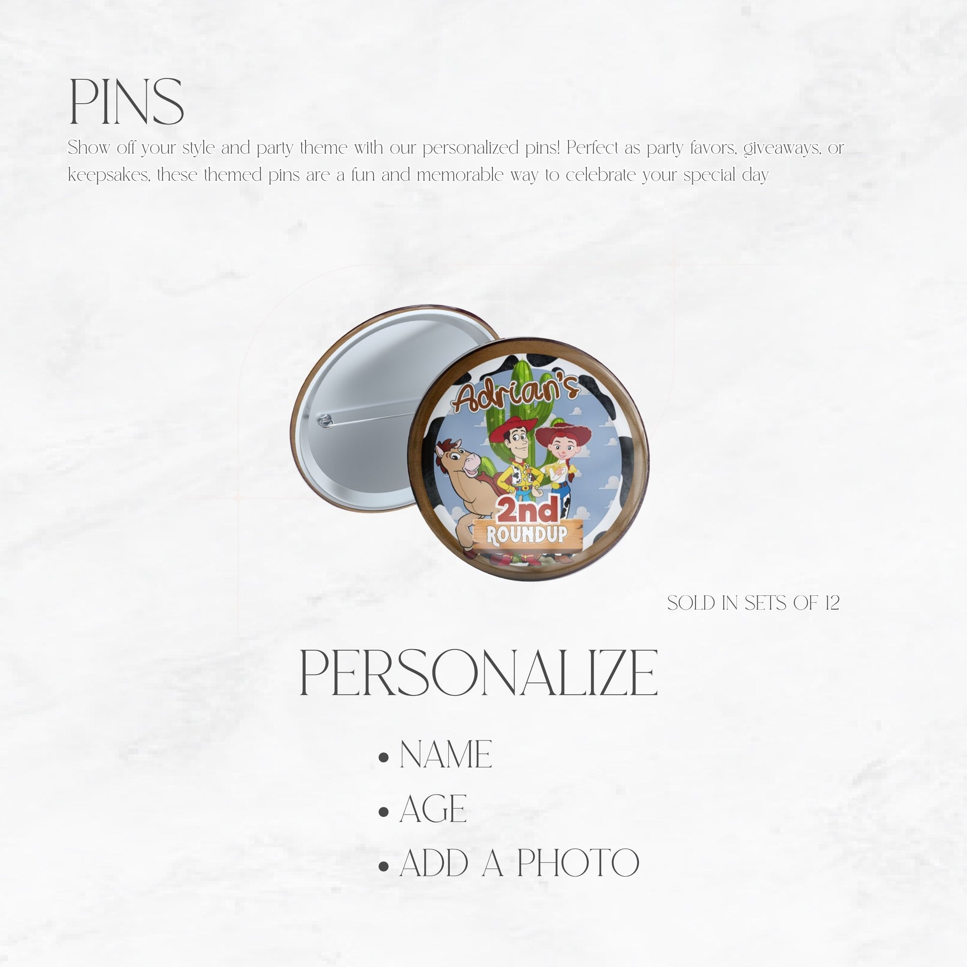 Round up the cuteness with these Toy Cowboy Roundup-themed pins! These personalized 2.25" buttons are the perfect accessory or party favor for a Toy Story-inspired celebration. Great for party guests, birthday outfits, gift bags, or even as keepsakes, each pin is customized with your childโs name and age.