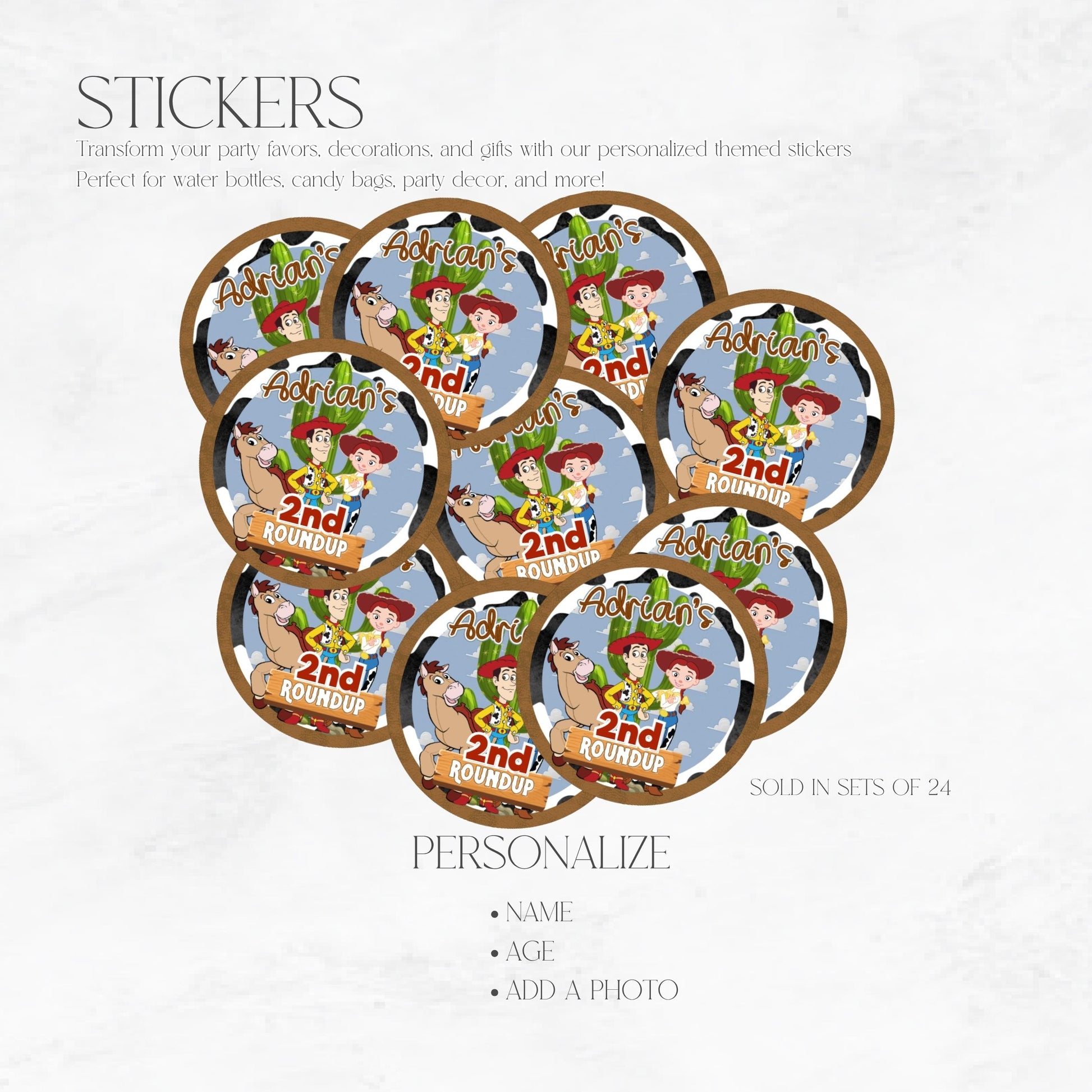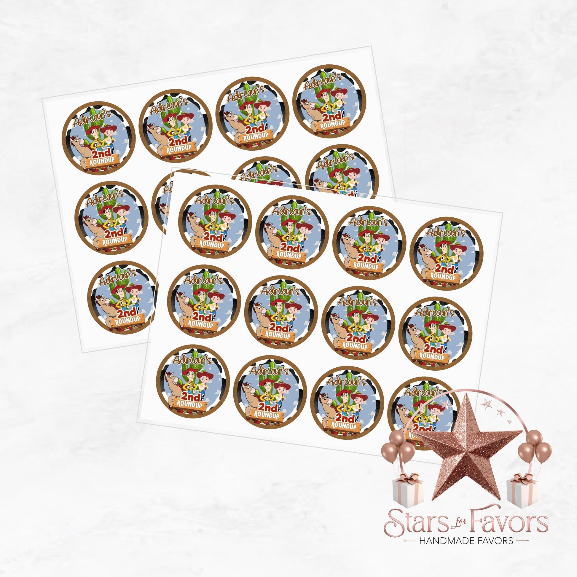 Stick with style! These Toy Cowboy Roundup themed stickers are the perfect personalized detail to tie your party together. Great for favor bags, candy wrappers, cups, thank-you tags, and more! Customize each sticker with your child's name and age to match your cowboy or Toy Story-inspired birthday theme.