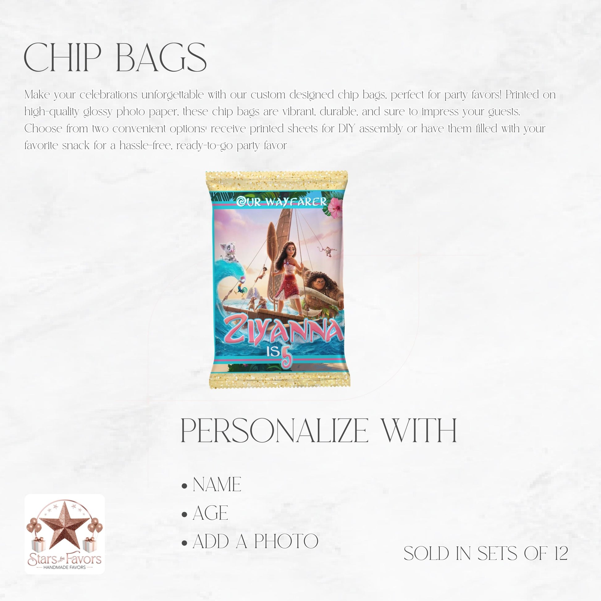 Set sail for fun with our Wayfinder Adventure chip bags – perfect for your ocean explorer’s next birthday celebration! Featuring vibrant tropical artwork, beloved island characters, and personalized details like your child’s name and age, these bags bring a wave of excitement to any party table.